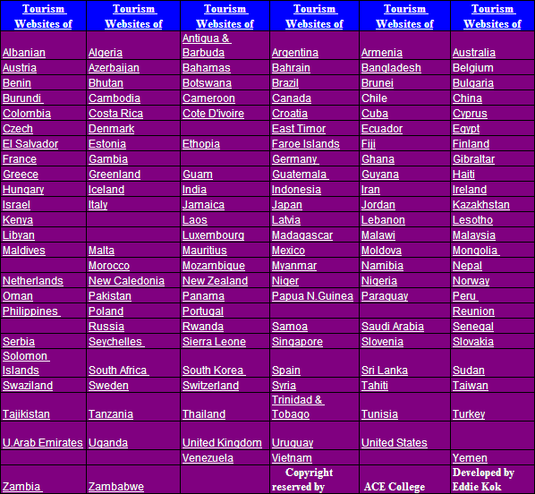 For past 3 years since 2010, we had published in ACE College website a weekly series of 147 out of total 152 official National Tourism websites, only 5 remaining well-known countries do not have proper national tourism websites, these will be replaced by other countries. We had revised the World Tourism Websites to include only ONE official National Tourism Website for each country which will be launched soon.